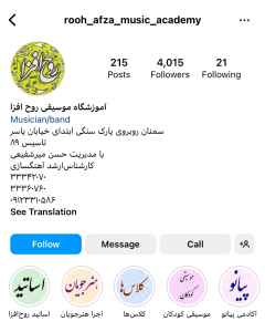 | 5 | آموزشگاه موسیقی روح افزا | سمنان، ولیعصر، بین شهید عبدالرضا کرم الدین و بعثت | 09123310586 |